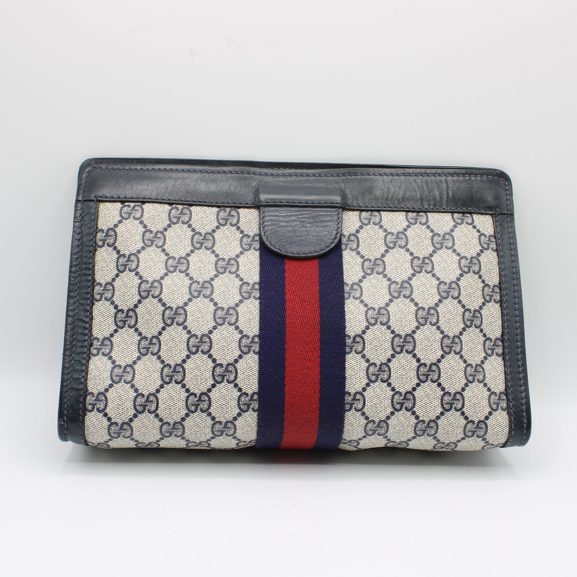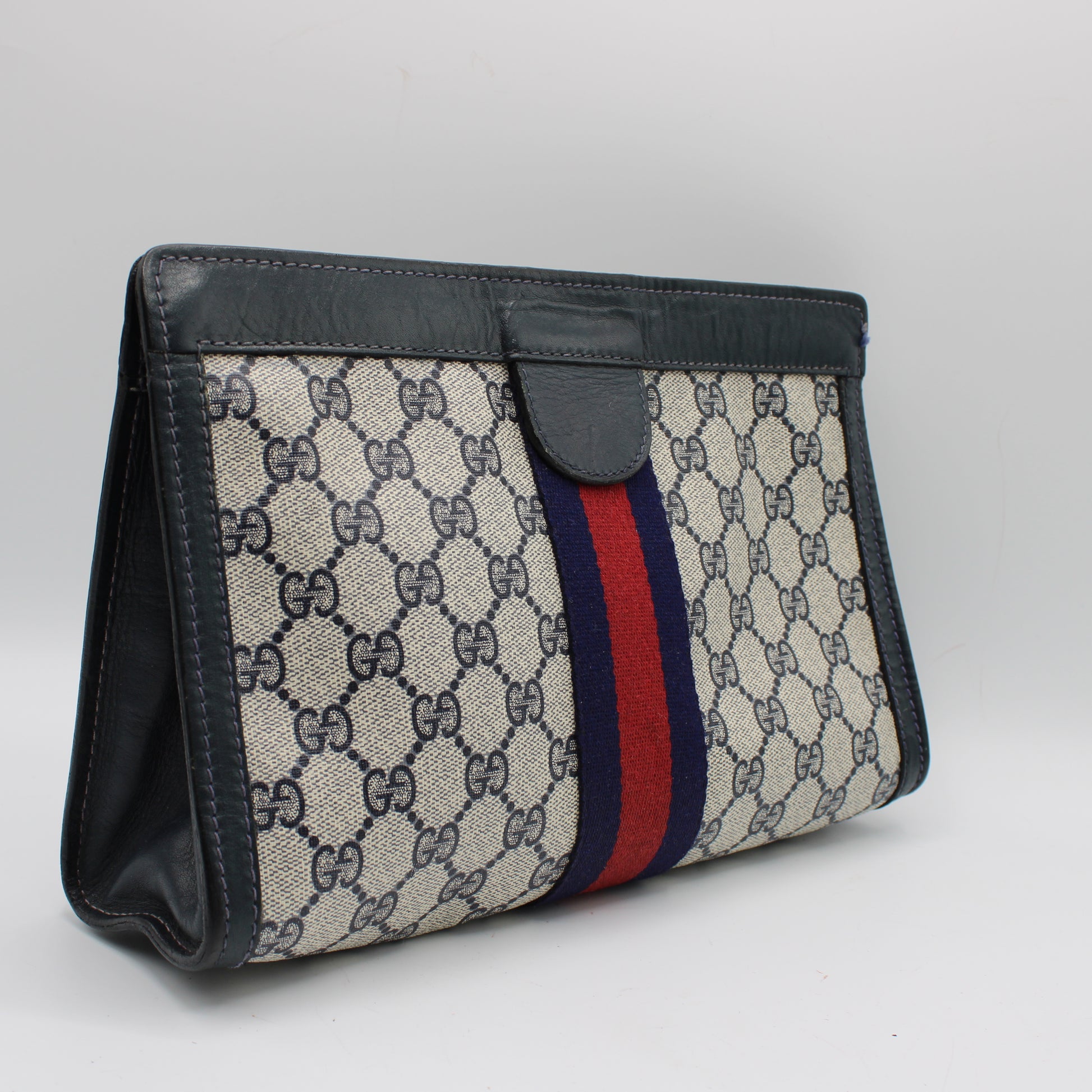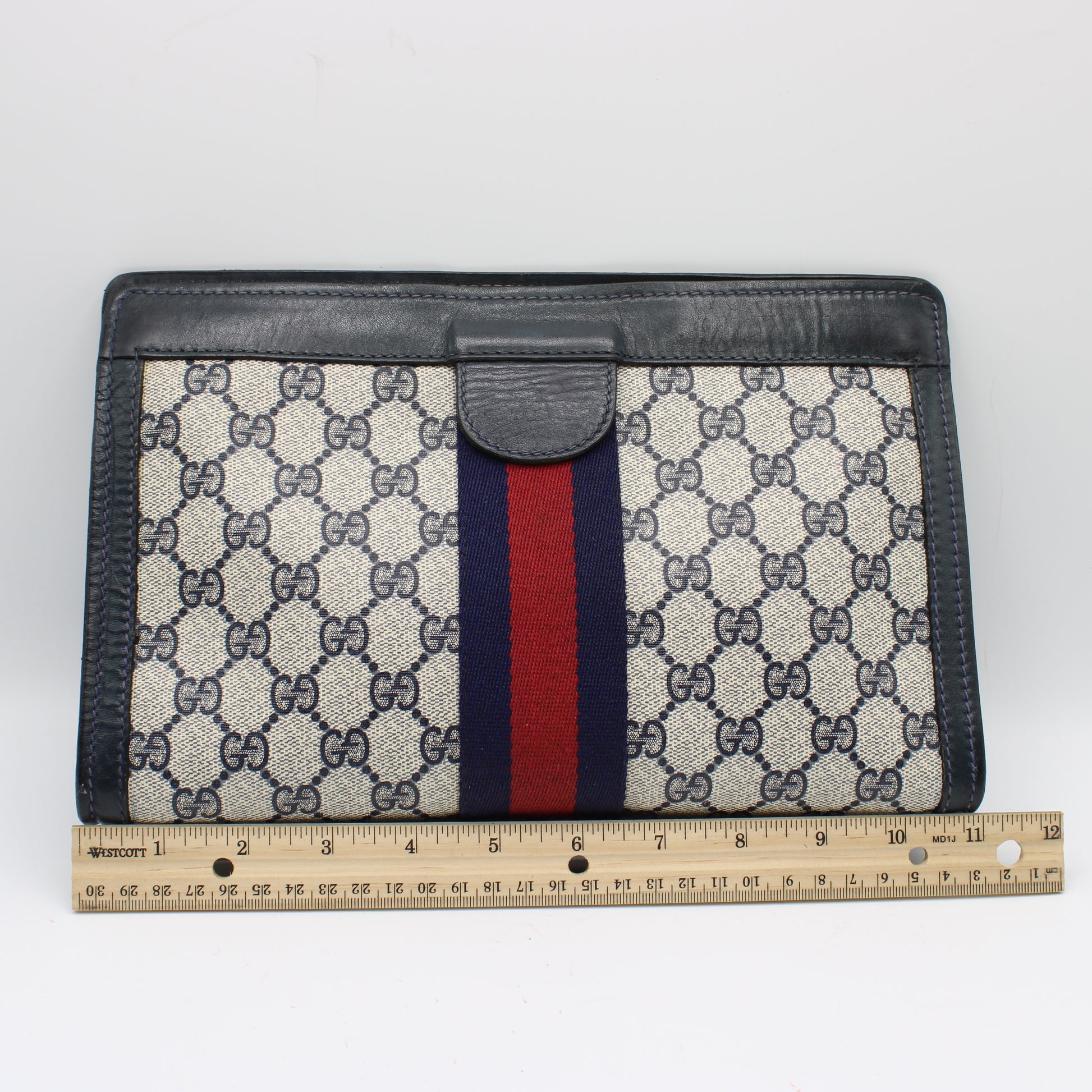 Stefany Bags Shoes and More proudly presents this authentic vintage Gucci navy GG canvas Sherry stripe clutch, a timeless luxury accessory crafted in Italy. This classic piece features the iconic GG monogram canvas in a sophisticated beige and navy tone, accented with the signature red and navy Sherry web stripe down the center. Finished with rich navy leather trim and structured leather sides, this clutch embodies the refined heritage Gucci is known for. The Velcro top closure offers secure and easy access, while the elegant silhouette makes it perfect for day-to-evening wear. A versatile addition for collectors seeking authentic vintage Gucci clutches available in Boston, this piece pairs effortlessly with both casual and elevated looks.