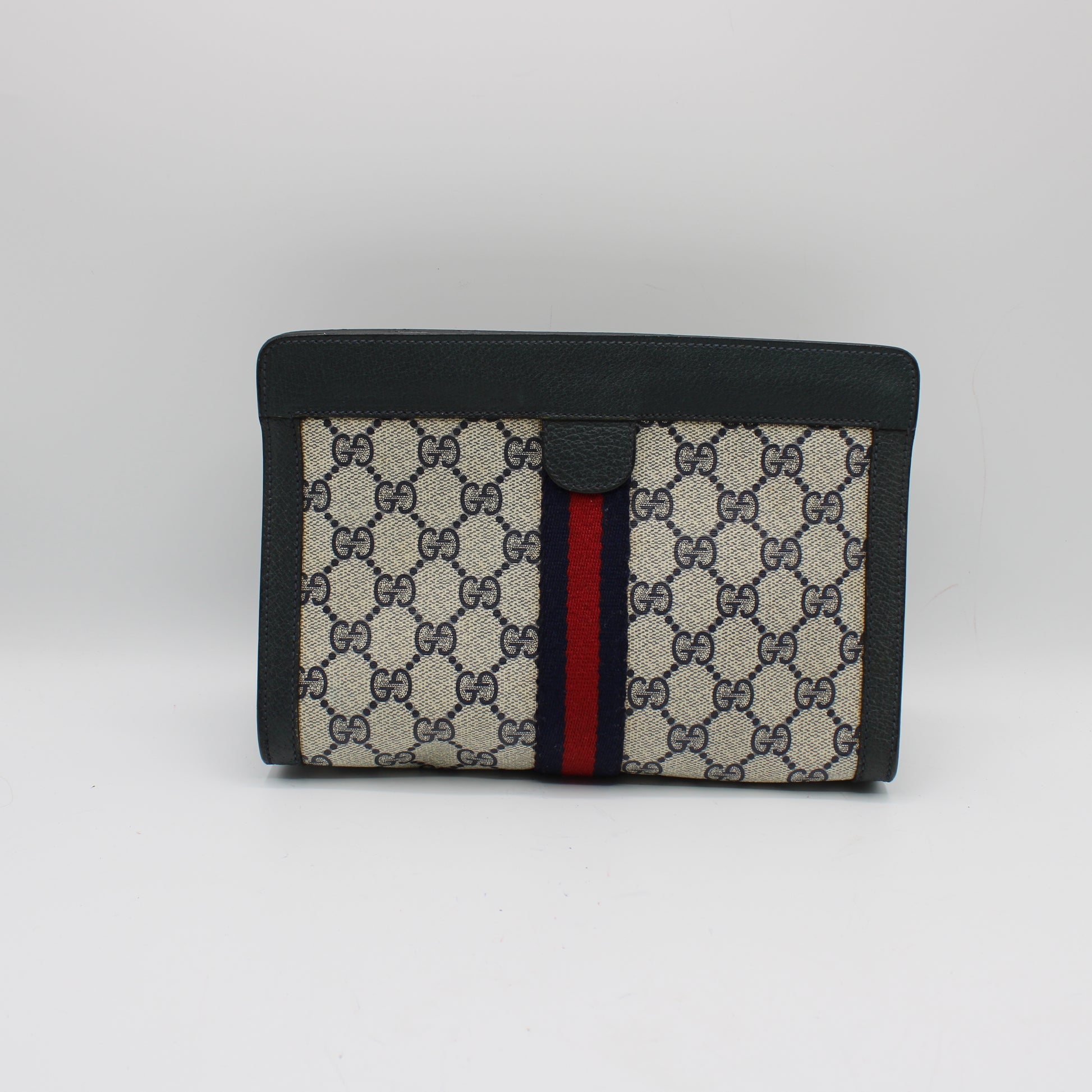 Stefany Bags Shoes and More proudly presents this authentic vintage Gucci Navy Leather Monogram Sherry Line Clutch, a timeless accessory that reflects classic Italian craftsmanship and iconic Gucci heritage. Crafted from durable GG Supreme coated canvas paired with rich navy leather trim, this clutch features the signature Sherry web stripe in red and navy, instantly recognizable and eternally stylish. The structured silhouette and sleek Velcro closure make it a versatile piece, perfect for carrying essentials day or evening. This authentic vintage Gucci clutch is a sought-after style among collectors and fashion lovers searching for authentic vintage Gucci bags available in Boston and beyond.