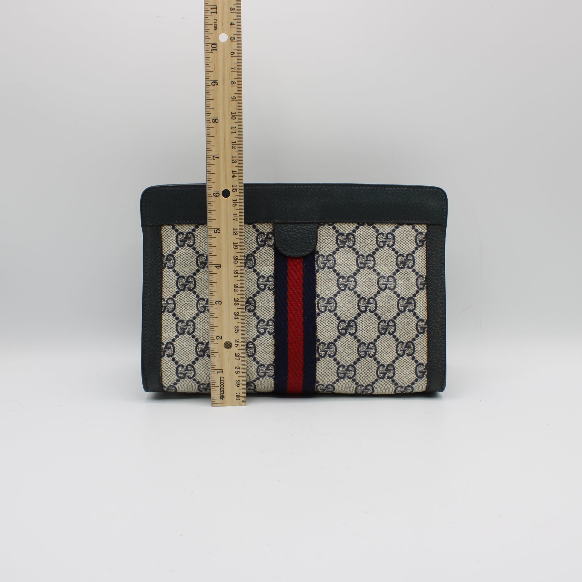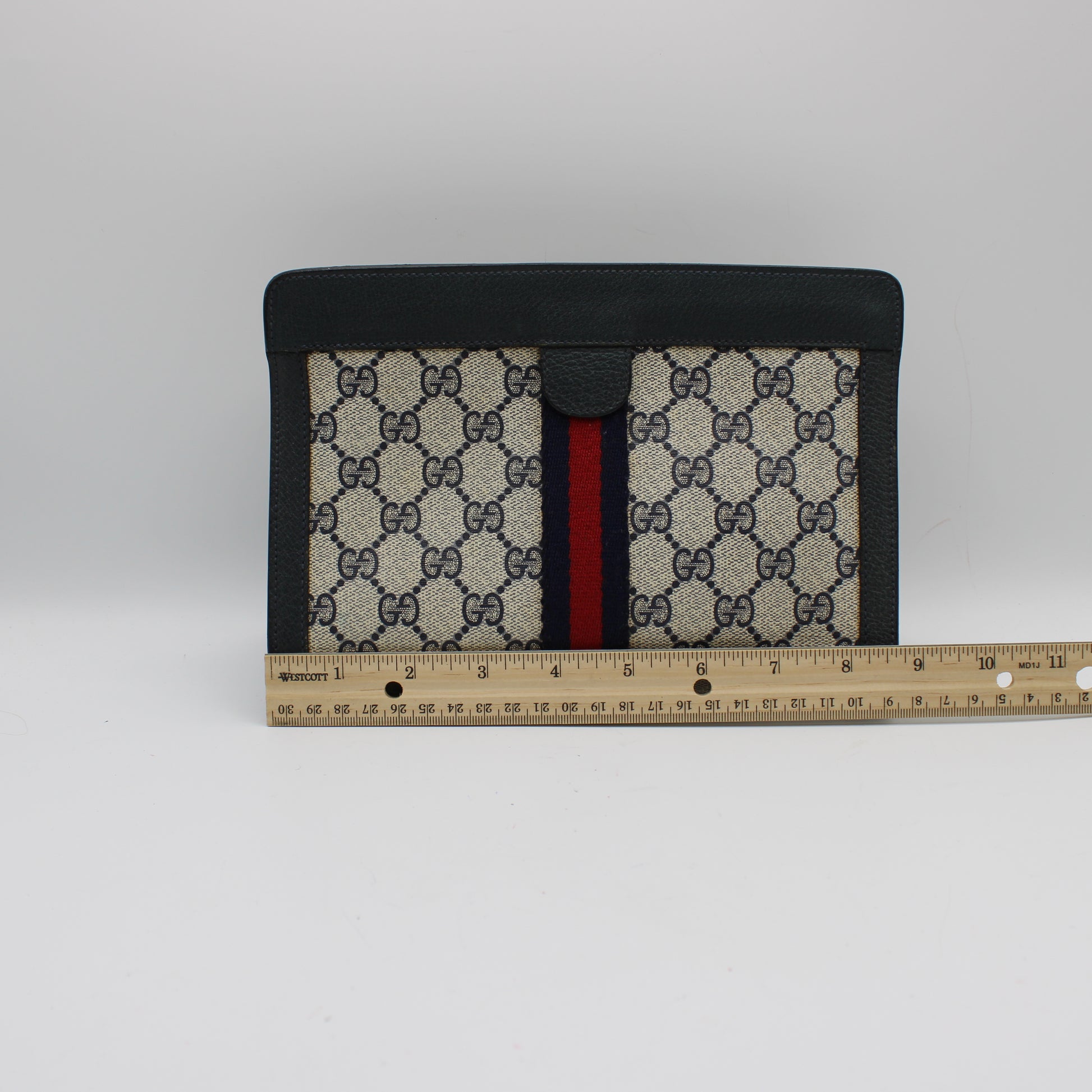 Approximate measurements are 9 inches wide by 6 inches high, making it ideal for essentials such as a phone, wallet, and keys. This piece is perfect for anyone seeking authentic vintage Gucci clutches, vintage designer bags in Boston, or a classic statement accessory with lasting value.