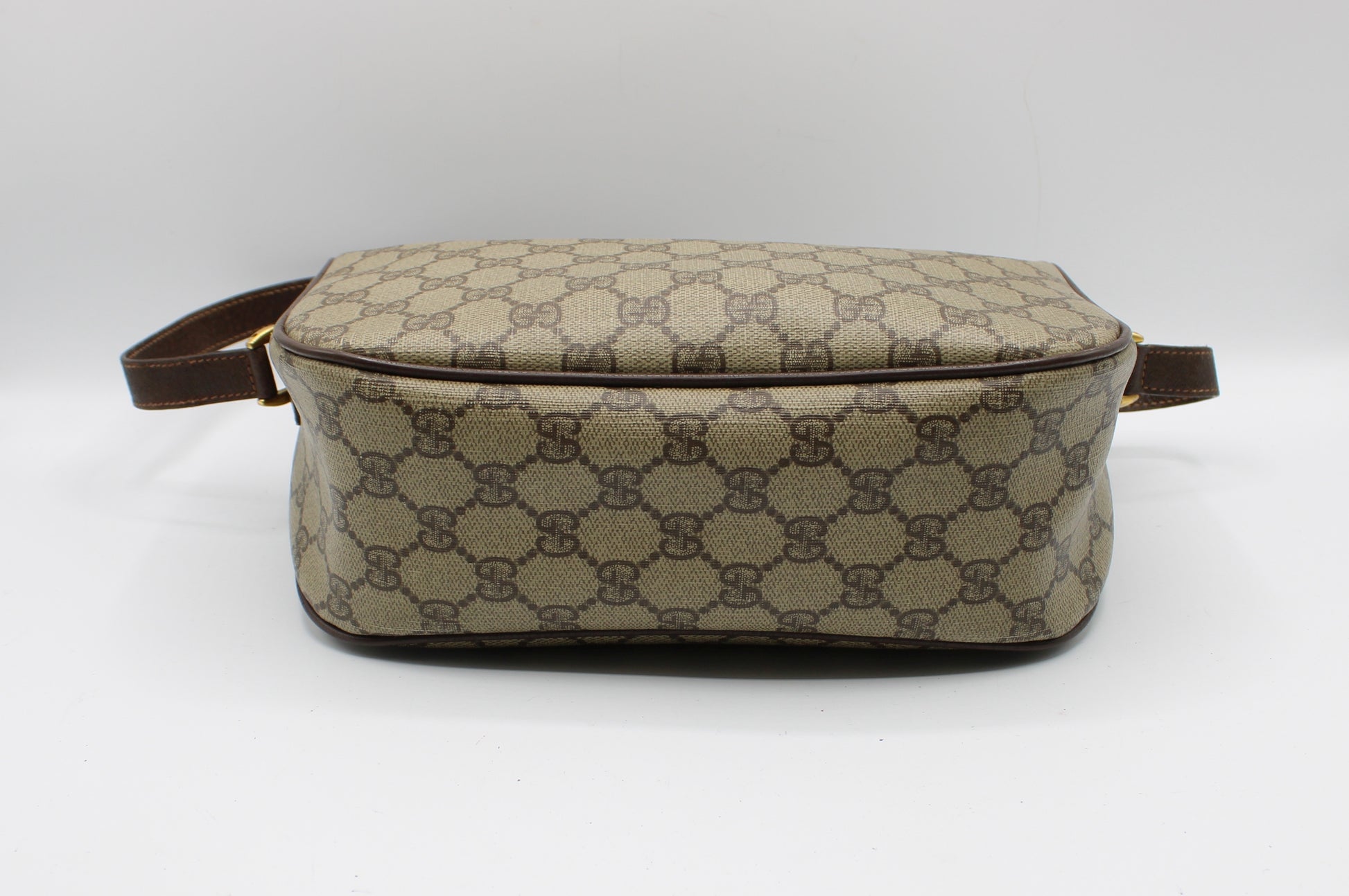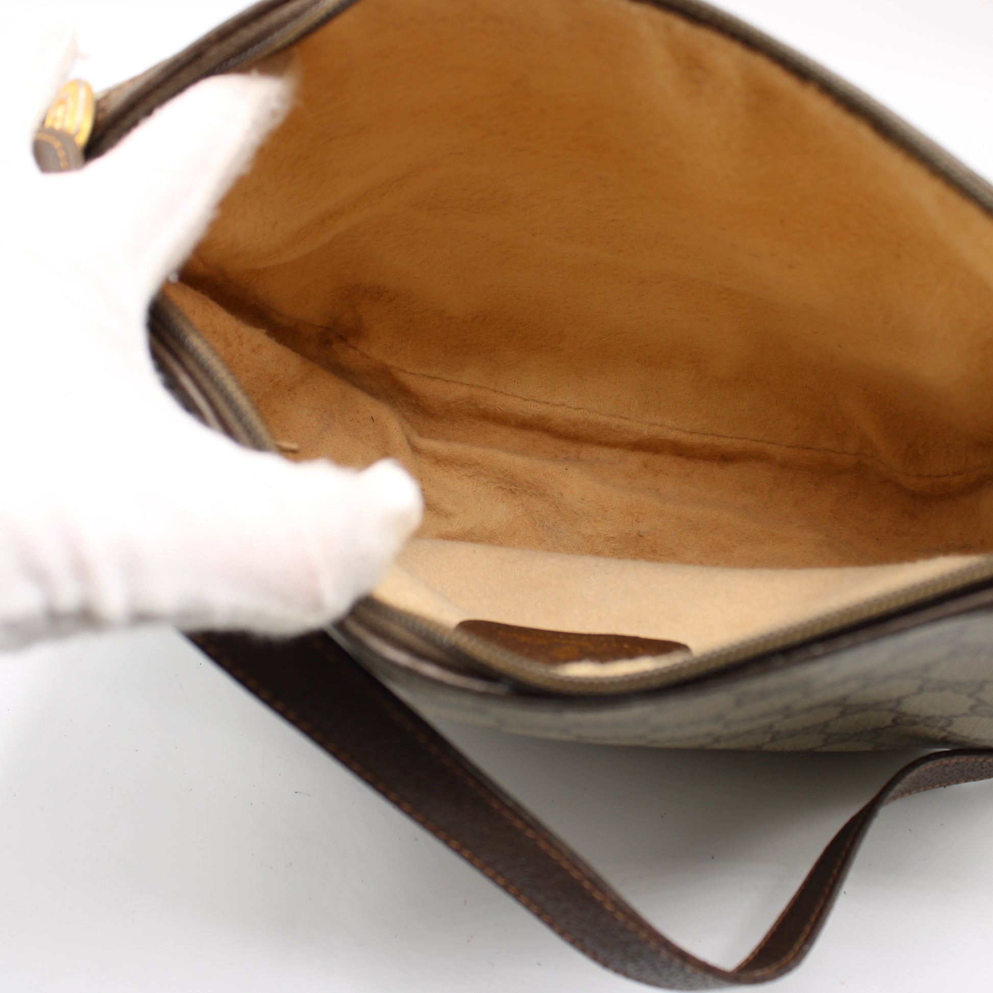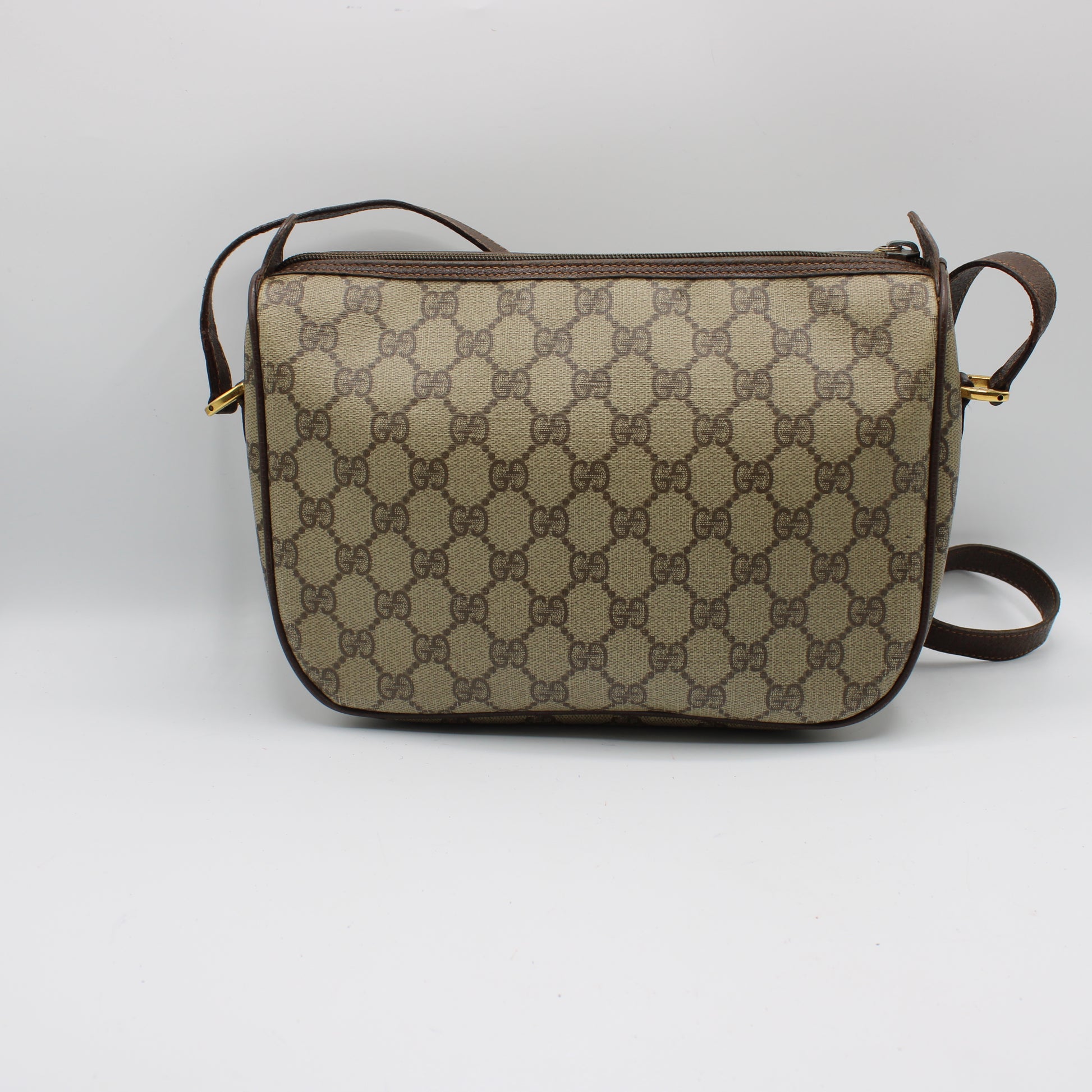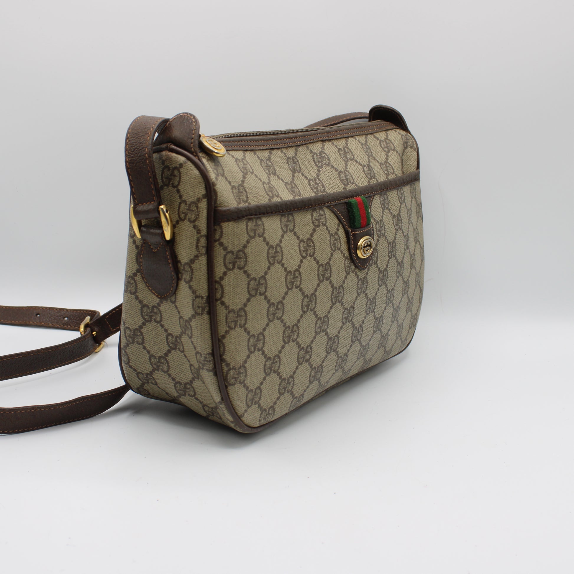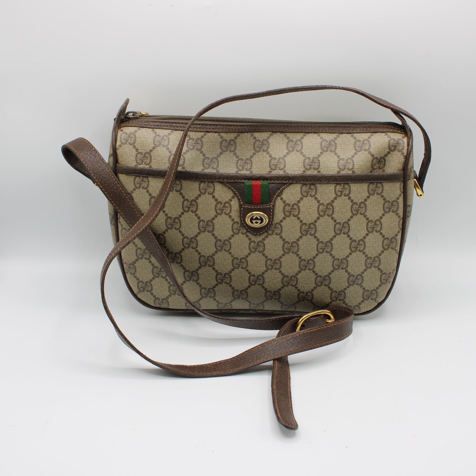 Stefany Bags Shoes and More presents an authentic Gucci Ophidia GG Supreme Crossbody Bag, a timeless classic that seamlessly blends luxury with practicality. Crafted from Gucci’s signature GG Supreme coated canvas with rich brown leather trim, this vintage beauty is both durable and stylish. The adjustable leather strap ensures versatile wear, allowing it to be styled as a shoulder or crossbody bag. The front pocket is adorned with the iconic green and red Web stripe, complemented by the classic metal GG logo hardware. The zip-top closure opens to a spacious beige suede-lined interior, perfect for carrying daily essentials while maintaining a sophisticated look.