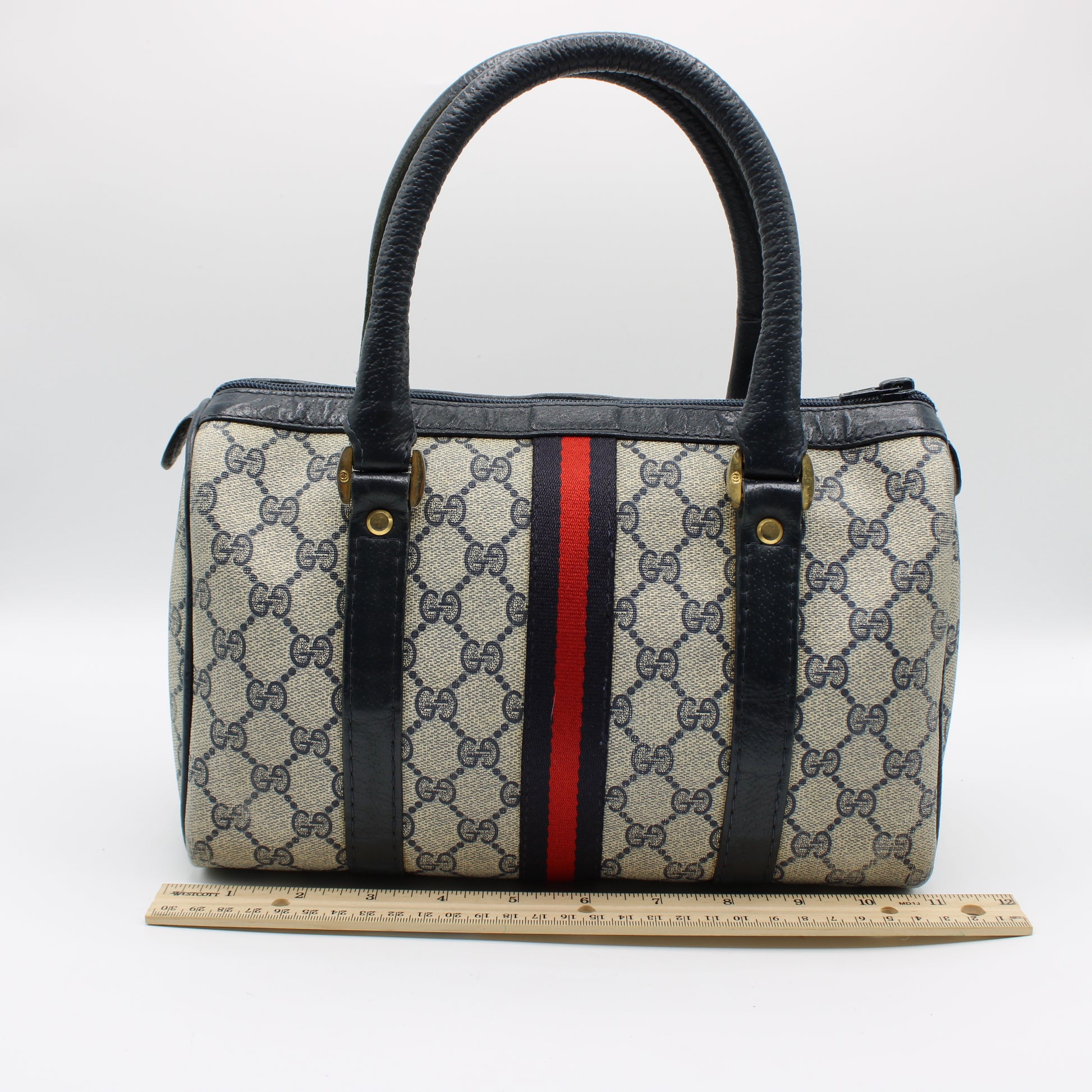 Stefany Bags Shoes and More presents this authentic Gucci Ophidia Supreme Boston Bag, a stunning vintage piece that embodies timeless luxury and craftsmanship. Crafted from Gucci's iconic GG Supreme coated canvas, this bag features navy leather trim and handles, adding an elegant contrast to its beige and ebony monogram exterior. The classic red and navy Web stripe runs down the center, enhancing its unmistakable vintage charm. Perfectly sized at 11 x 7 inches, it offers a spacious interior for your essentials while maintaining its structured and compact silhouette.