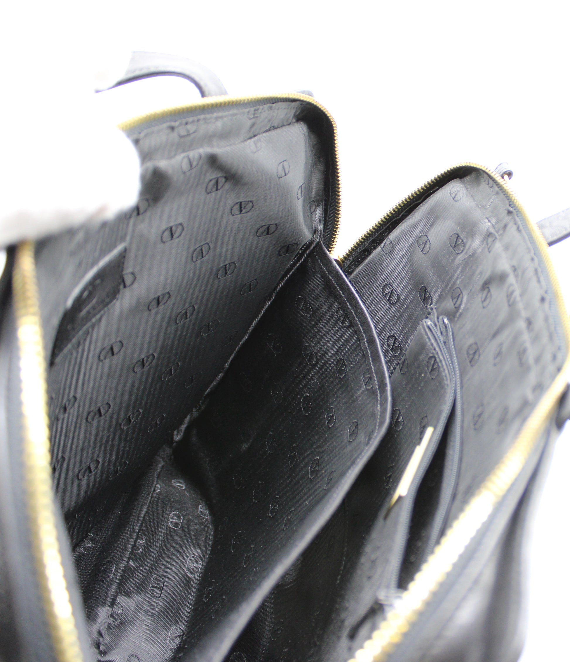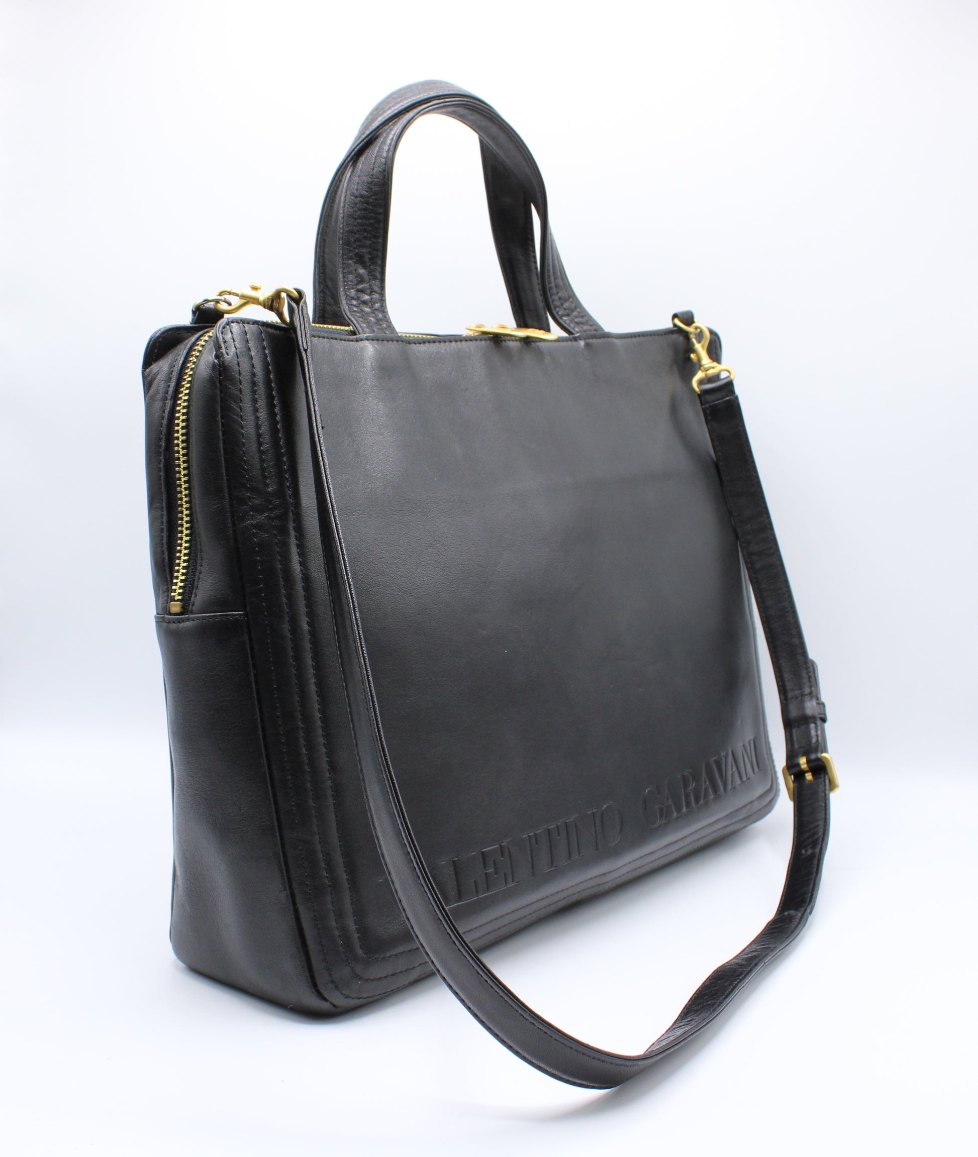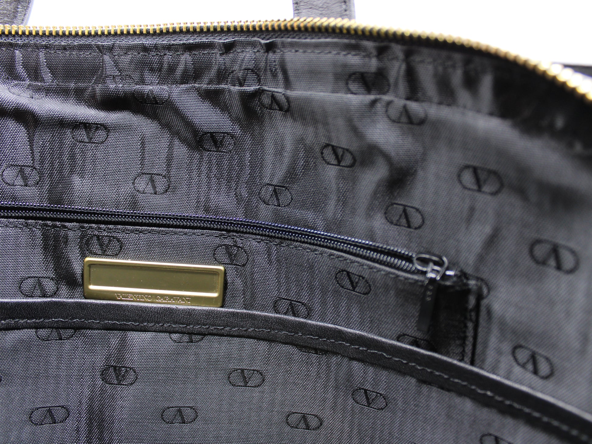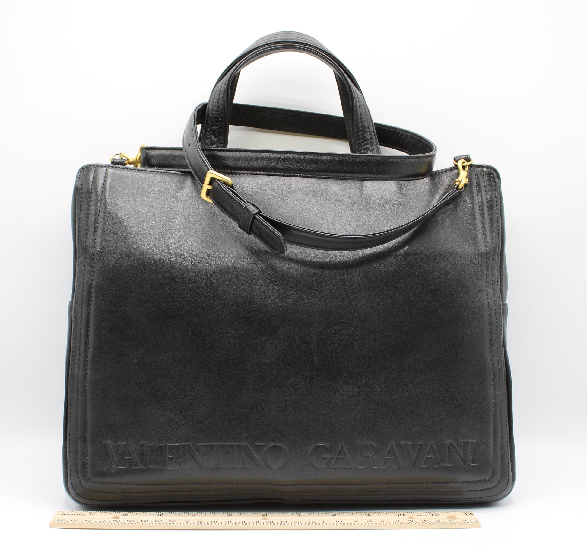 Stefany Bags Shoes and More proudly presents an authentic slice of fashion history with this Valentino Garavani Black Leather Briefcase. Measuring an ample 13 x 10 inches, this piece hails from the 1980s to 1990s, a period renowned for its robust designs and prominent branding.