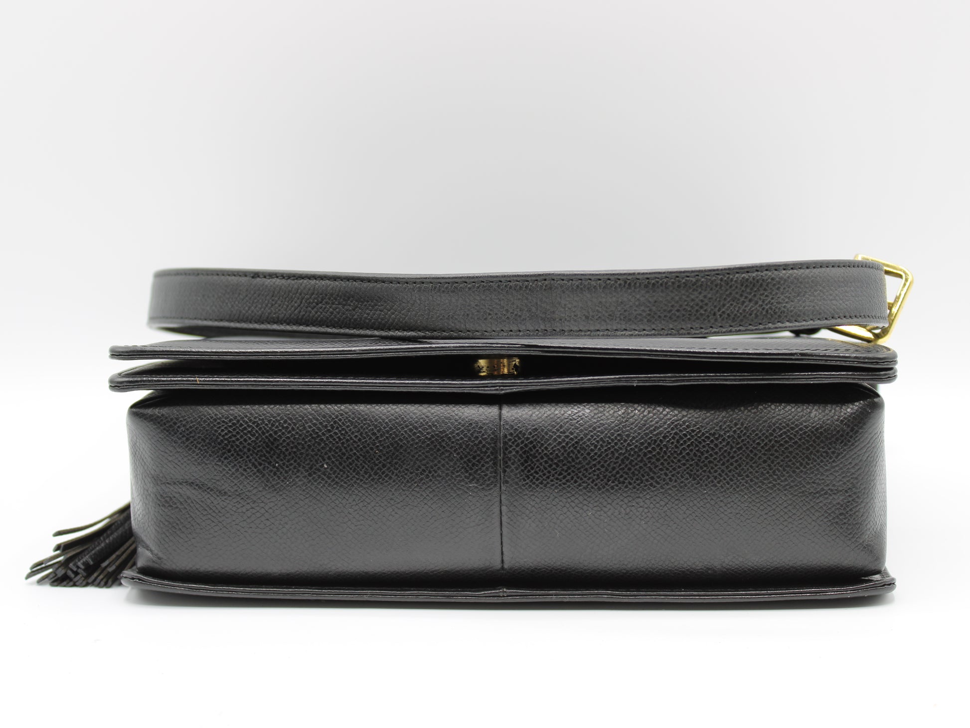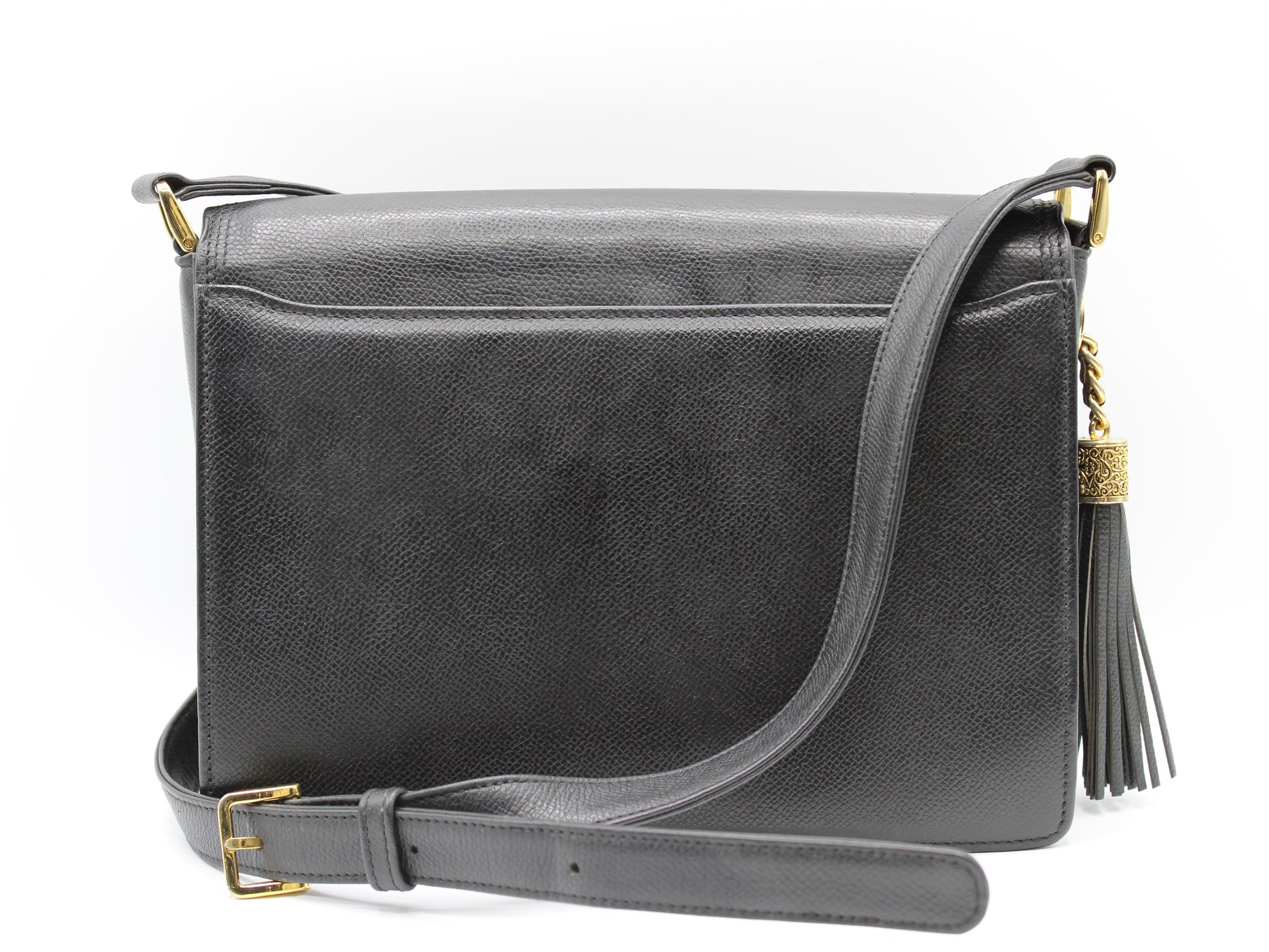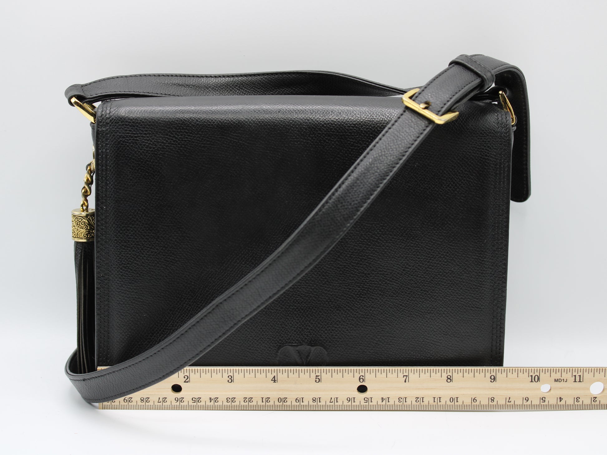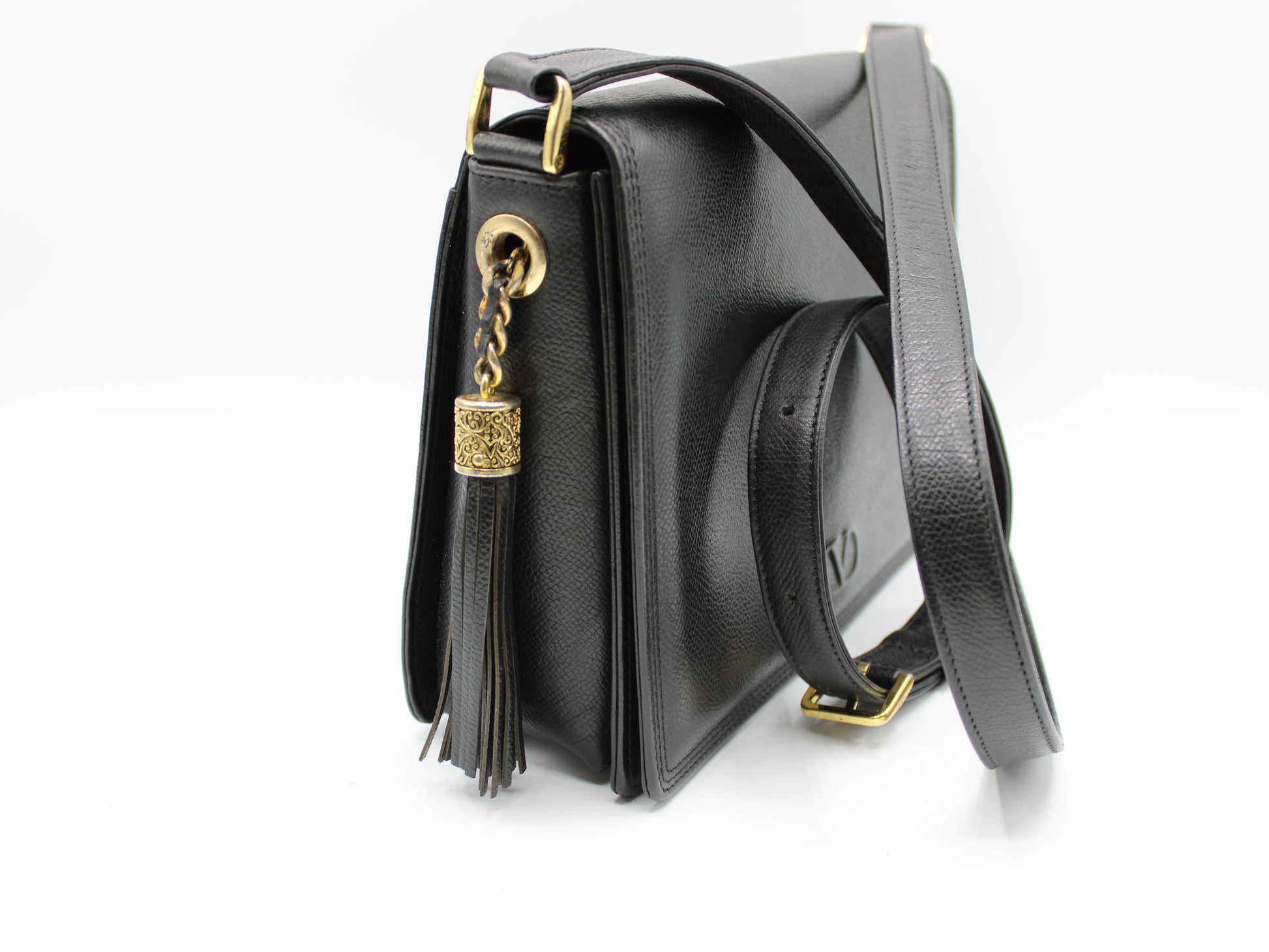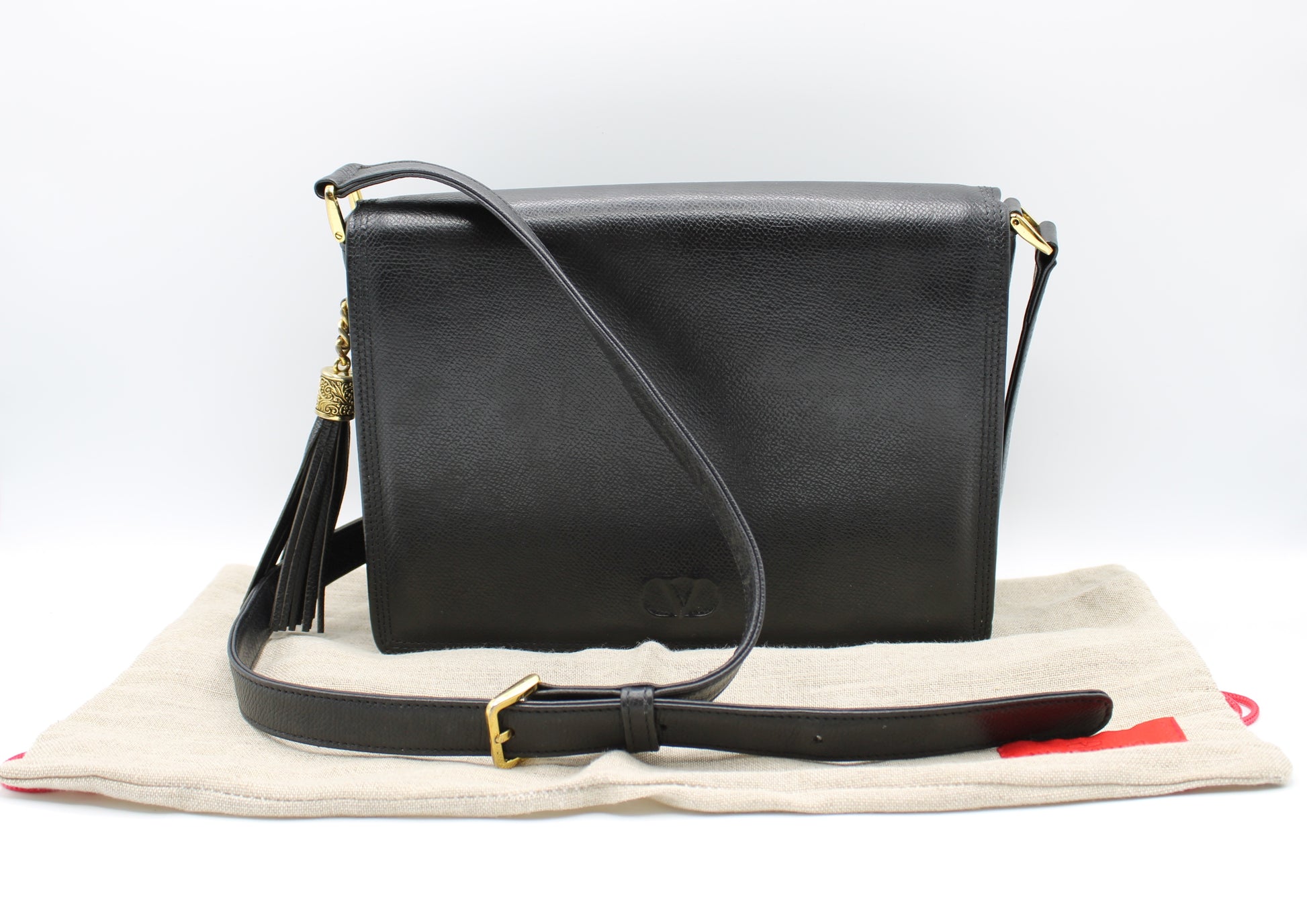 Stefany Bags Shoes and More presents a sophisticated Valentino Garavani black leather crossbody bag, perfect for those who appreciate the elegance of vintage luxury. Measuring at a convenient 7 inches in height and 9 inches in width, this exquisite piece boasts a timeless design complemented by a chic tassel accent, adding a touch of personality to its classic silhouette. The flap-over front ensures your belongings stay secure with style. This bag is in very good condition, demonstrating the exceptional quality and craftsmanship synonymous with the Valentino Garavani name.