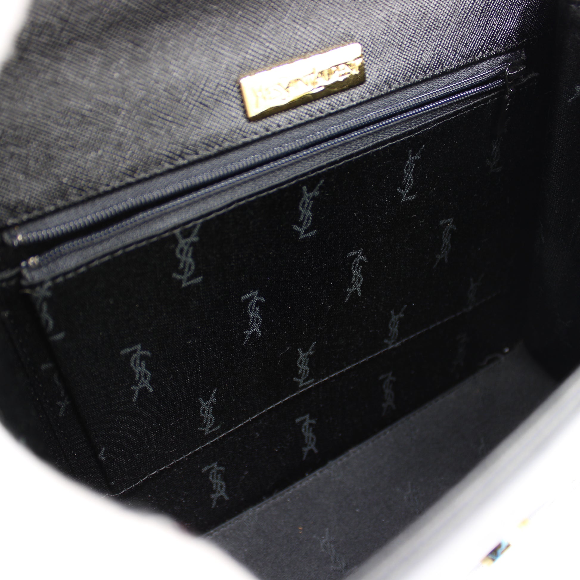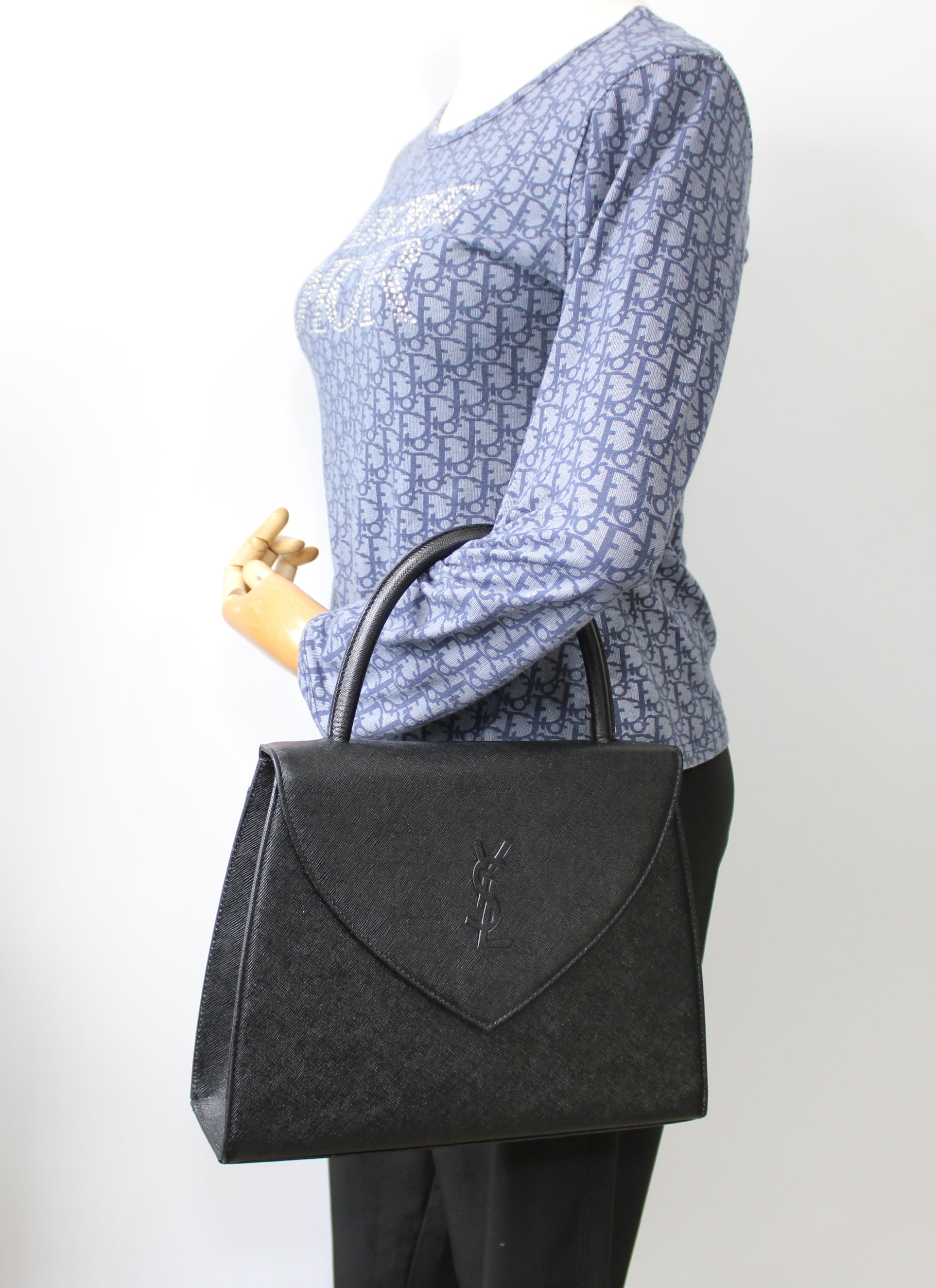 The bag measures approximately 11 inches in width and 8 inches in height, offering ample space for daily essentials while maintaining a sleek, structured profile. This authentic vintage Yves Saint Laurent top handle bag is a beautiful investment piece and a standout addition to any luxury collection.